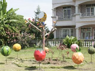 (記者郭政隆/嘉縣報導)新港大專青年聯誼會義工前往月眉社區,在舉辦樂活銀髮族生活營當中,運用漂流木和回收再利用的材質,再以南瓜、蕃茄、蕃薯、西瓜、梨和洋桔梗做為象徵,和阿公阿嬤們一同在社區九天宮旁廣場,打造出月眉古時的地理環境「七星伴月」,不只喚起長輩兒時記憶,也為社區內打造出一個美麗又有意義的裝置藝術。