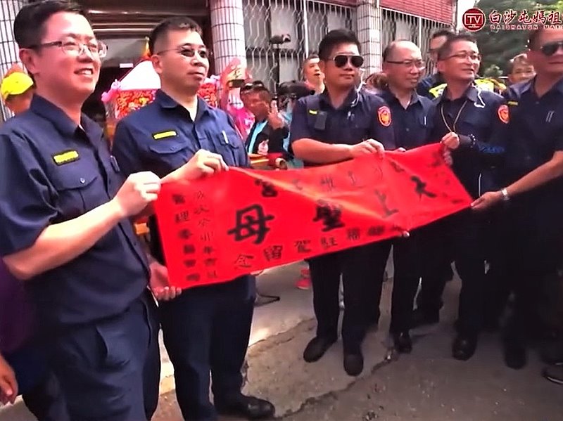 此時隨行的白沙屯拱天宮服務人員及勤務員警把隨行信眾隔離,騰出空間讓位給媽祖鑾轎駐駕,林分局長也率領著同仁虔誠頂禮參拜,所長黃涵成與竹園警友站站長楊坤川更是貼心準備了500顆祈福粽和冰涼飲料提供追隨媽祖的香燈腳補給,派出所周邊附近的店家和住戶民眾也擺設香案迎接媽祖鑾轎到來,讓站立於派出所前博愛路上的大批信眾把派出所周邊圍的水泄不通,白沙屯拱天宮媽祖廟隨行人員也致贈媽祖駐駕留念祈福紅布條。