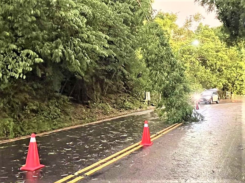 方、落石及溪水暴漲,低窪地區慎防積水;蘭潭公路地區亦受到突如其來的豪大雨影響,使得環潭公路路樹之枝葉垂落於道路上,路上散滿著落葉,影響往來之用路