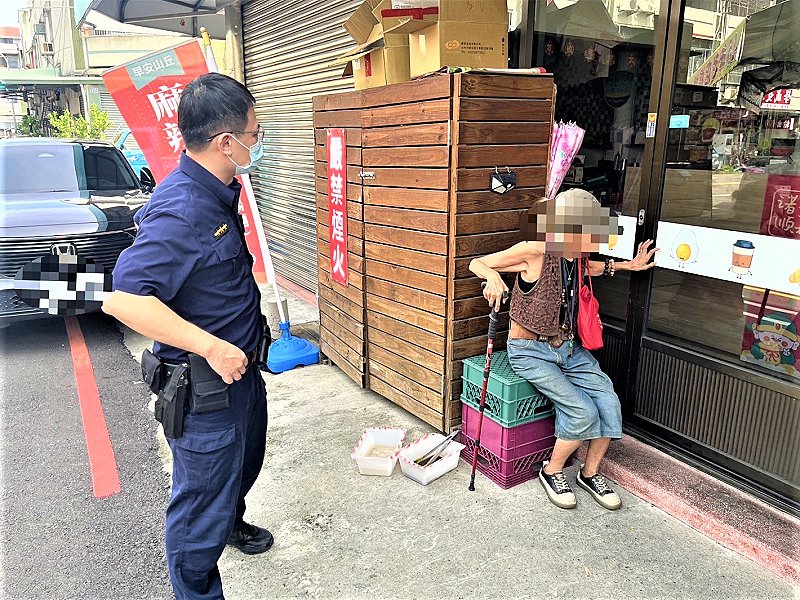 見有位老神情疲憊婦人在道路旁徘徊,疑似迷途,請警方到場協助;員警趕赴到場時,只見一名老婦坐在商家旁陰涼處休息。