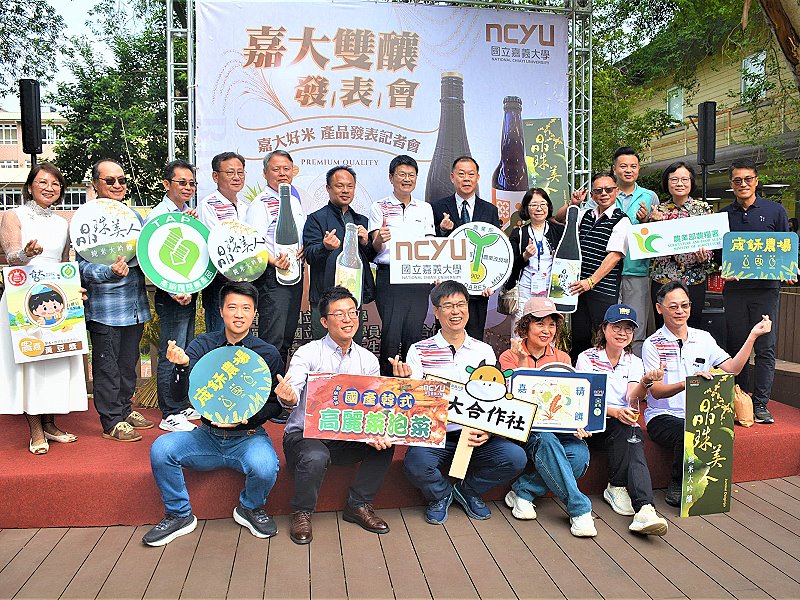 〔記者邱嘉琪、侯姵伃、郭政隆/嘉義市報導〕今年嘉義大學喜迎整併25週年校慶,11/21日於該校蘭潭校區員生消費會合作社沁心池廣場舉辦「嘉大雙釀新品發表暨多元產品開發發表會」,推出全新農糧產品,包括「嘉大銀禧精釀啤酒」、「晶珠美人純米大吟釀」、「國產韓式高麗菜泡菜」及「無麩質戚風蛋糕」等四款全新產品,展現嘉大在永續農業、食品加工與產學合作上的研發成果。
