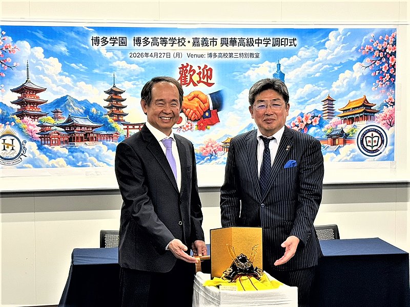 〔記者侯姵伃/嘉義市報導〕嘉義市私立興華高級中學推動國際教育再傳佳音;繼與和歌山、東京及沖繩等多所名校建立合作後,興華中學4/27日由王宇集團榮譽董事長王崇旭親率團隊,赴日與九州指標性名校「博多學園」正式簽署合作備忘錄(MOU),雙方締結為姊妹校,這場於福岡舉行的簽約儀式,象徵興華中學在九州地區的教育布局邁向制度化與長期化的新里程。